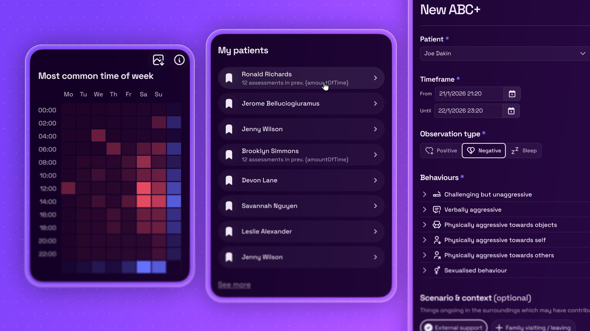 Renamed “Time of behaviour” to “Observation start” across ABS and ABC+ assessment lists